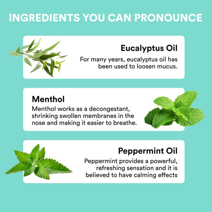 Ingredients: Menthol, Wintergreen Oil, Eucalyptus Oil, Peppermint Oil, Cornmint Oil, Petitgrain Oil, Spearmint Oil.