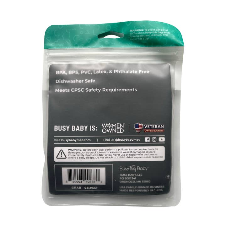 This adorable happy crab teether easily connects to the Busy Baby Mat with our patented tether system to ensure your child always has their favorite toy within reach. This adorable teething toy is designed with a multi-texture surface, easy grip for your baby’s small hands, and is hypoallergenic and dishwasher safe.