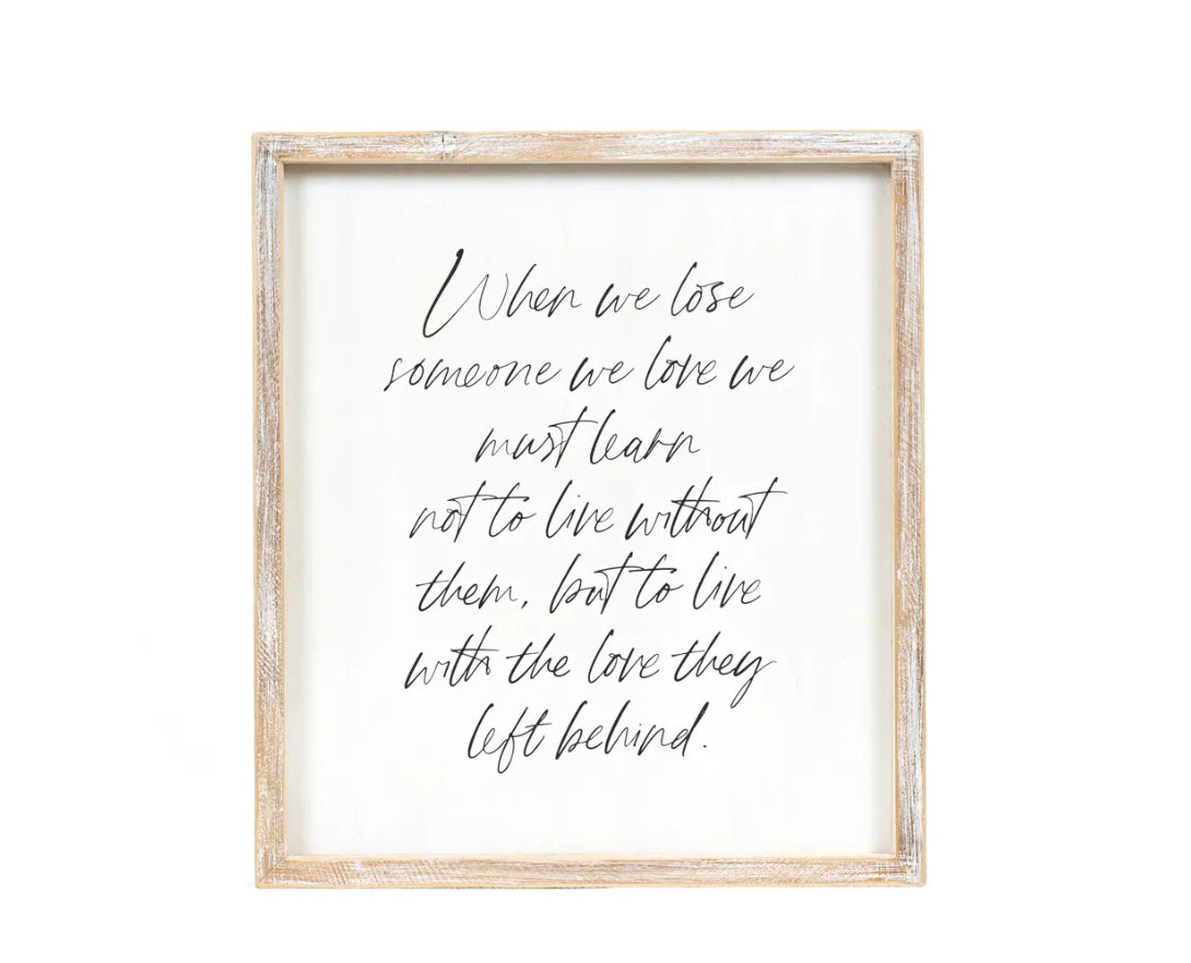 Measuring 12x14x1.5 inches, the sign features a deeply meaningful quote: "When We Lose Someone We Love, We Must Learn Not to Live Without Them, But to Live with the Love They Left Behind."